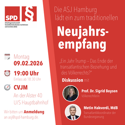 - Mitgliederversammlungen, auf denen wir über organisatorische Fragen und inhaltliche Projekte und Anträge beraten (Mitglied der ASJ Hamburg kann jedes rechts- oder justizpolitisch interessierte Mitglied der Hamburger SPD werden – schreibt uns jederzeit gern an asj@spd-hamburg.de)